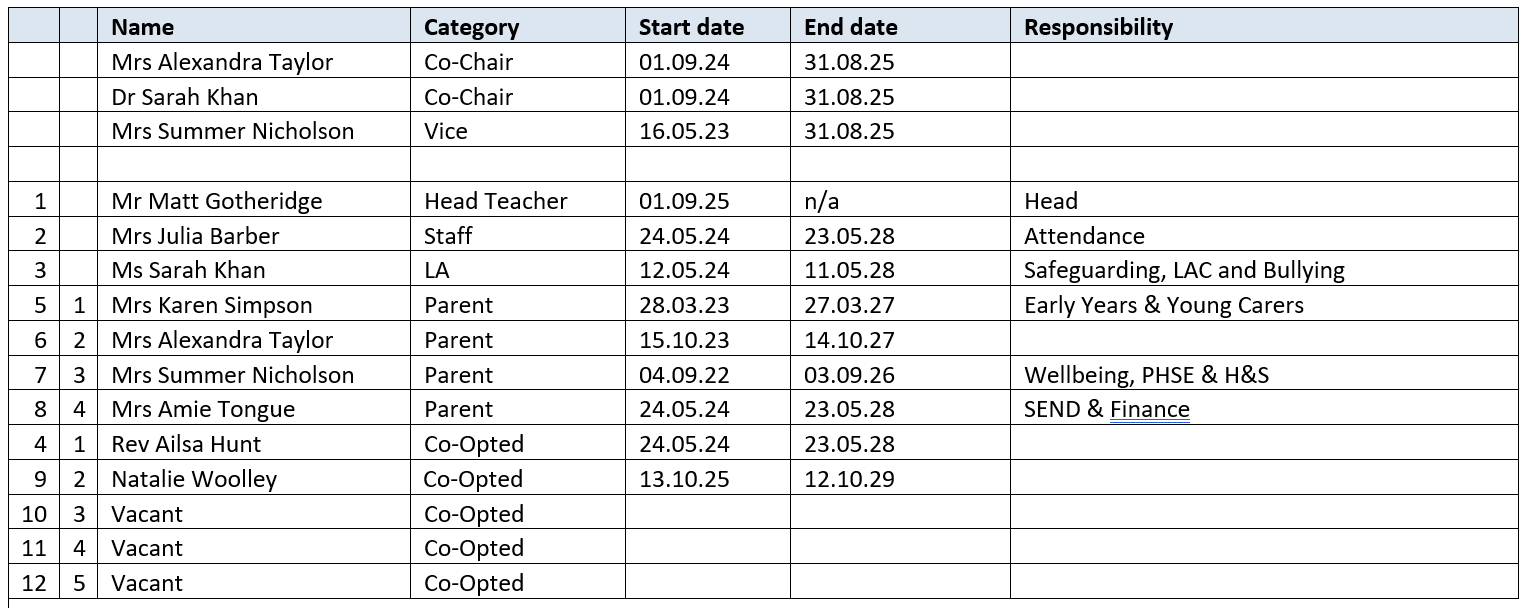 It is a privilege to work alongside the volunteers and staff who are part of our governing body; they take a keen interest in the school and ensure that they provide challenge and support as we strive to ensure the very best provision for all pupils.